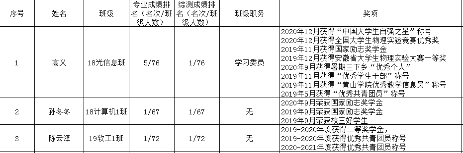 根据安徽省教育厅《安徽省教育厅关于做好2021-2022学年学生资助工作的通知》(皖教秘〔2021〕324号)、《JinNianHui.com国家奖学金管理办法》(校学〔2020〕8号)要求,进行JinNianHui.com国家奖学金评审,拟推荐高义、孙冬冬、陈云泽三位同学为2021年国家奖学金获得者。现公示如下:
